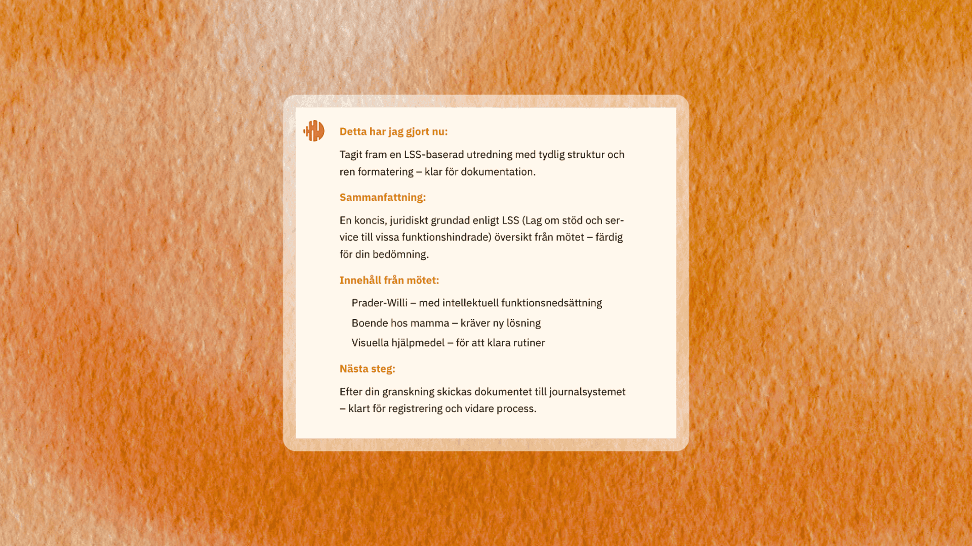 Uppföljningar, interna möten, intervjuer, telefon- och teamssamtal dokumenterade automatiskt enligt era rutiner.